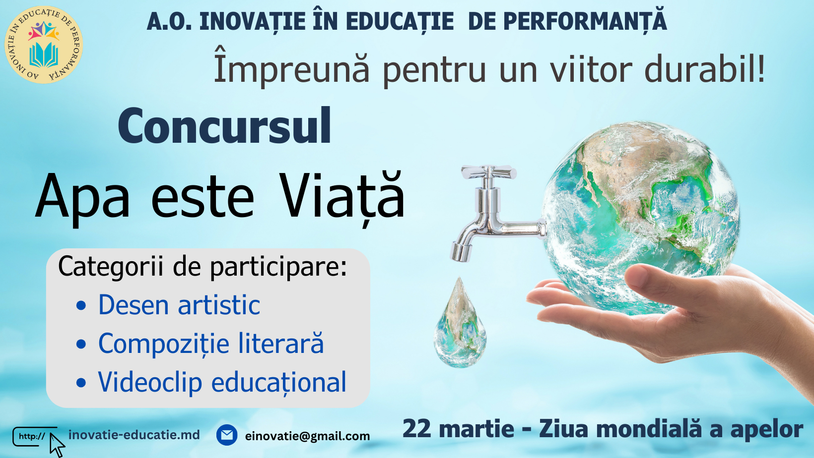 AO Inovație în Educație de Performanță vă invită să participați la Concursul Internațional „APA ESTE VIAȚĂ” ce are ca scop conștientizarea și promovarea importanței apei în viața noastră de zi cu zi și încurajarea elevilor să protejeze resursele acvatice. Participanții vor avea oportunitatea de a-și exprima creativitatea și cunoștințele legate de conservarea și protejarea resurselor de apă.