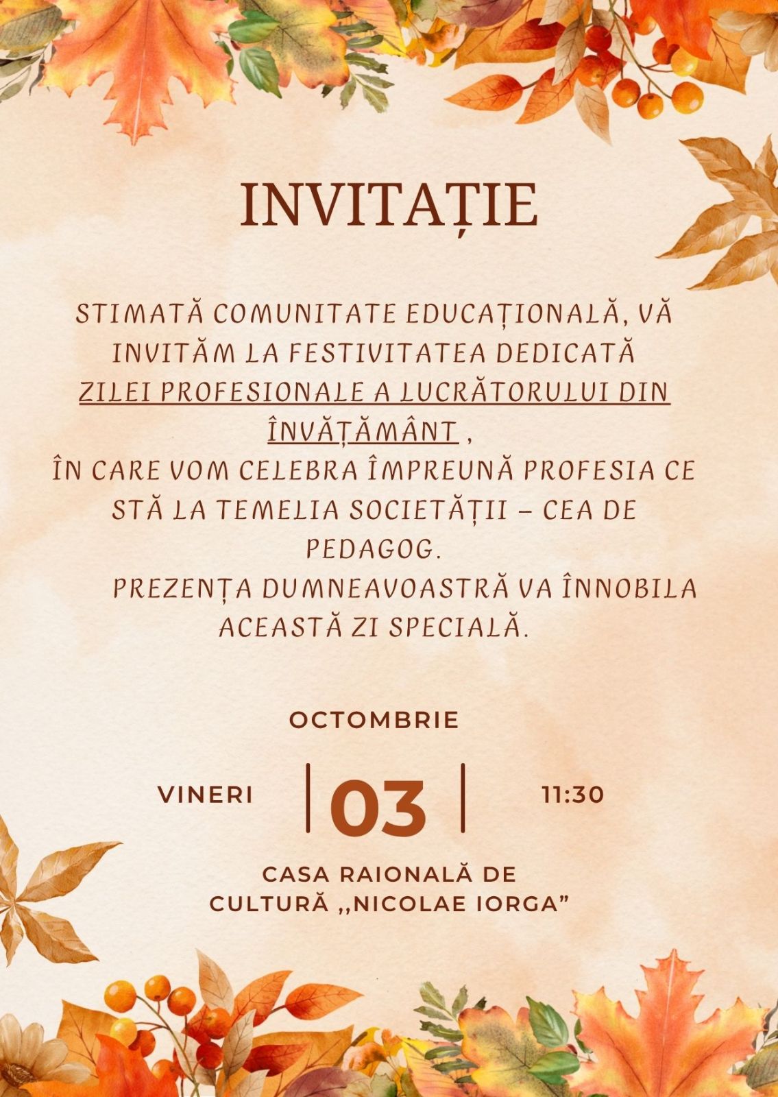 Invitație Ziua Lucrătorului de învățământ.
