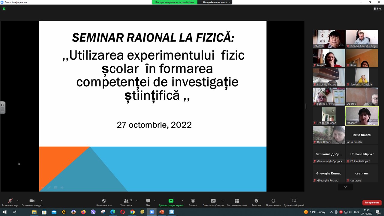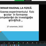 În data de 27.10.2022 s-a desfășurat seminarul raional a profesorilor de fizică, cu tematica: „Utilizarea experimentului fizic școlar în formarea competenței de investigație științifică. La seminar au participat profesorii de fizică din toate instituțiile de învățământ din raionul Sîngerei. Comunicările prezentate de doamnele profesoare de fizică: Bolohan Valentina, LT„I.Creangă” Rădoaia, Cirimpei Angela gim„V.Alecsandri”, Cucereavii Tatiana gim„Gr.Vieru” Heciul Nou, au arătat cum cu ajutorul experimentului putem dezvolta competențele de bază la fizică.