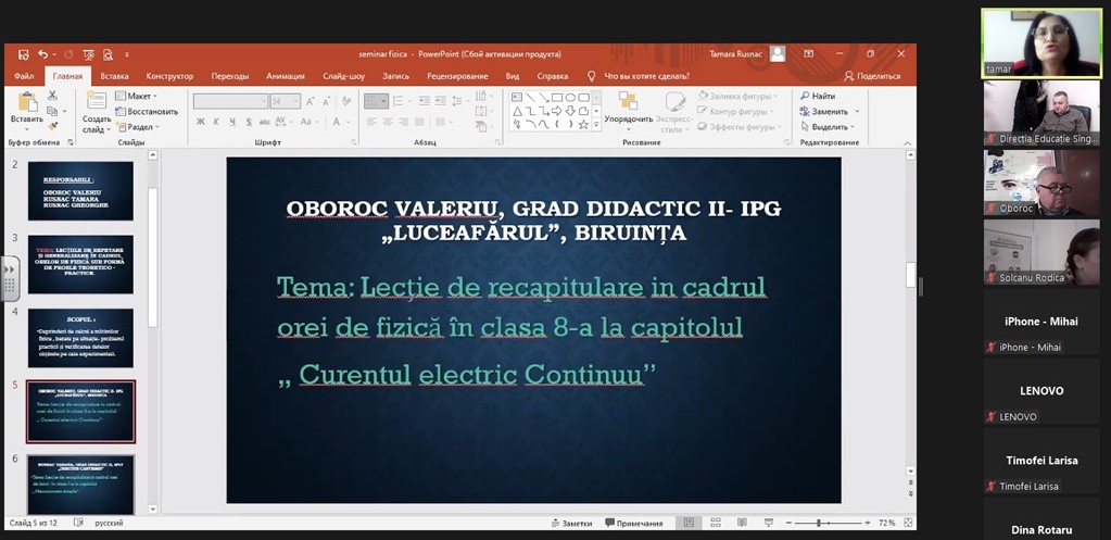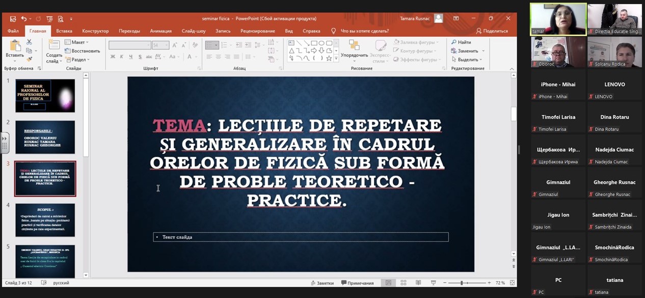 La 08.12.2022 în regim online s-a desfășurat seminarul raional a profesorilor de fizică cu tematica “Lecții repetare și generalizare în cadrul orelor la fizică”. Scopul şi obiectivul seminarului au fost realizarea politicilor educaționale la disciplina Fizică .Astronomie şi perfecționarea profesională continuă a profesorilor de fizică şi propagarea experienței avansate. La seminar au participat profesori de fizică din gimnazii și licee din raion.